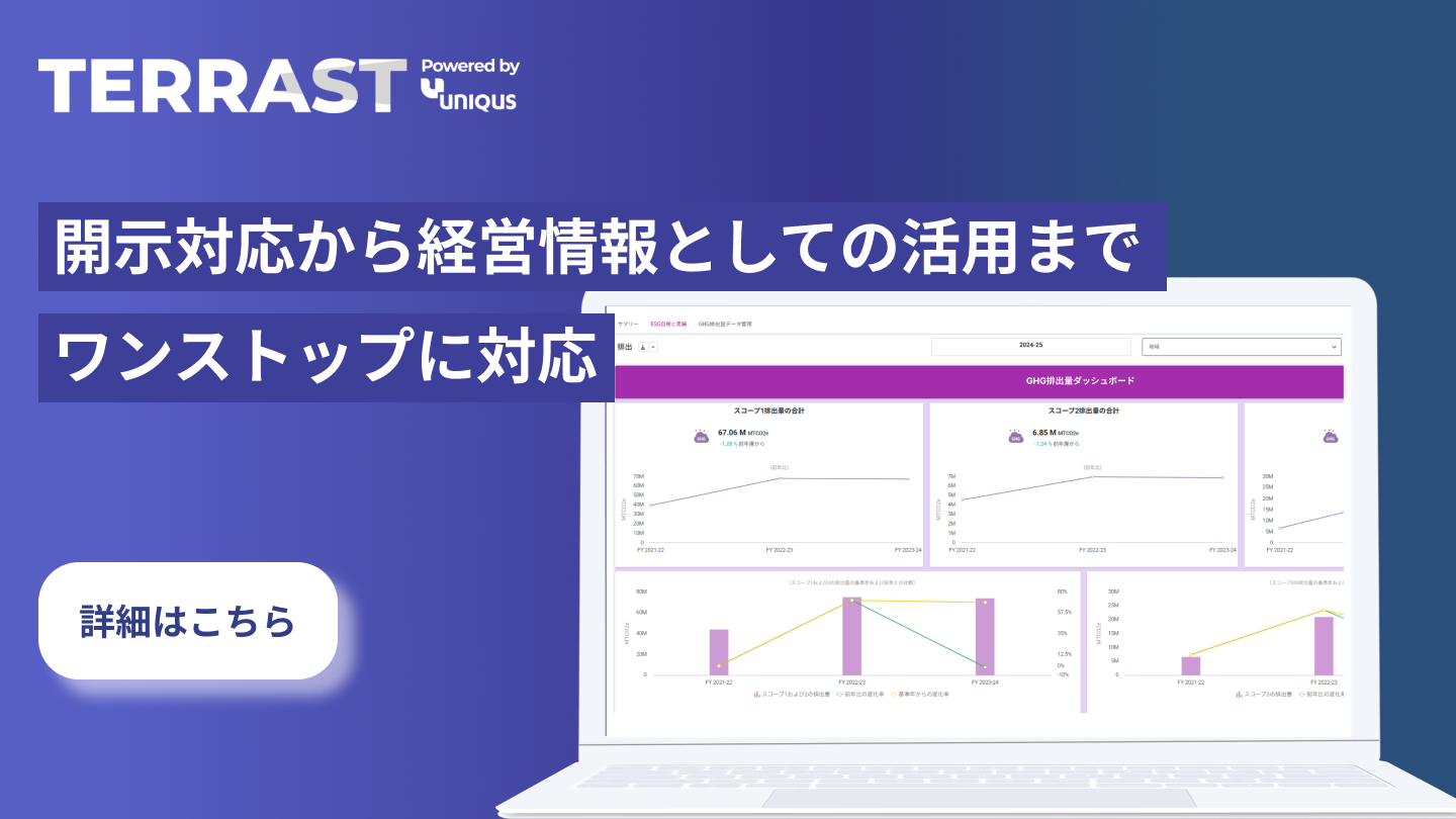 最新のサステナビリティ情報開示体制構築・ESGデータ管理・保証準備を効率的に進めたい方は、ESG・サステナビリティ対応の統合プラットフォーム「TERRAST for Enterprise」の活用をぜひご検討ください。